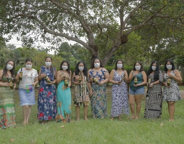 Mestra Diva e mulheres Calins durante o I Encontro de Mulheres Ciganas de MT produzem garrafada para saúde da mulher. Foto: Karen Ferreira.