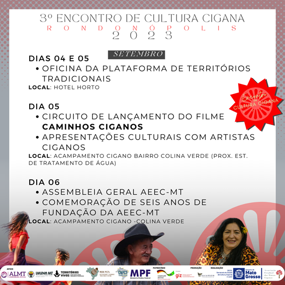 Nesta edição, o Encontro contou com o patrocínio da Secel-MT, por meio do Edital Viver Cultura 2022, que patrocinou a Oficina de Chibe e o Encontro de Mulheres Ciganas.